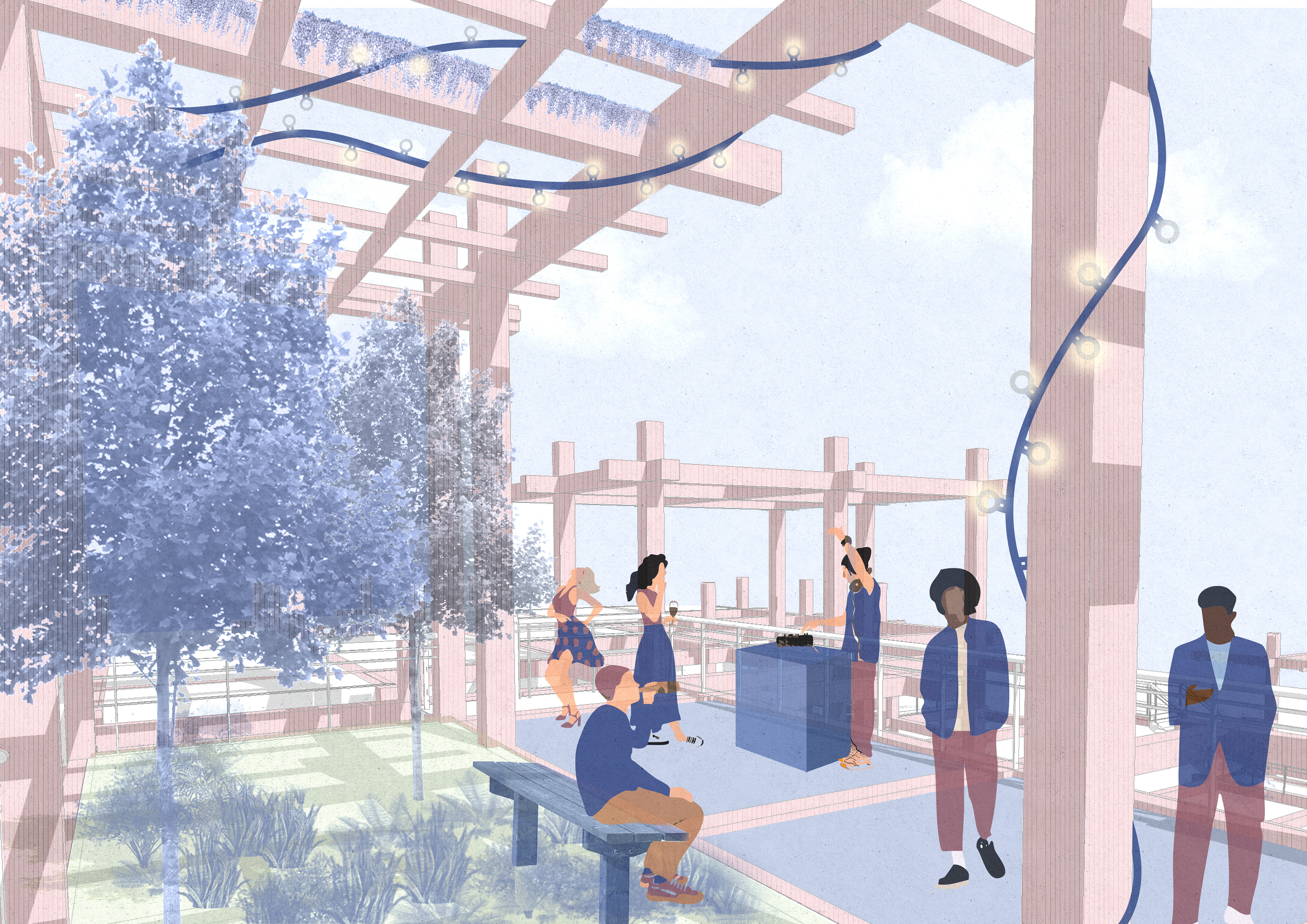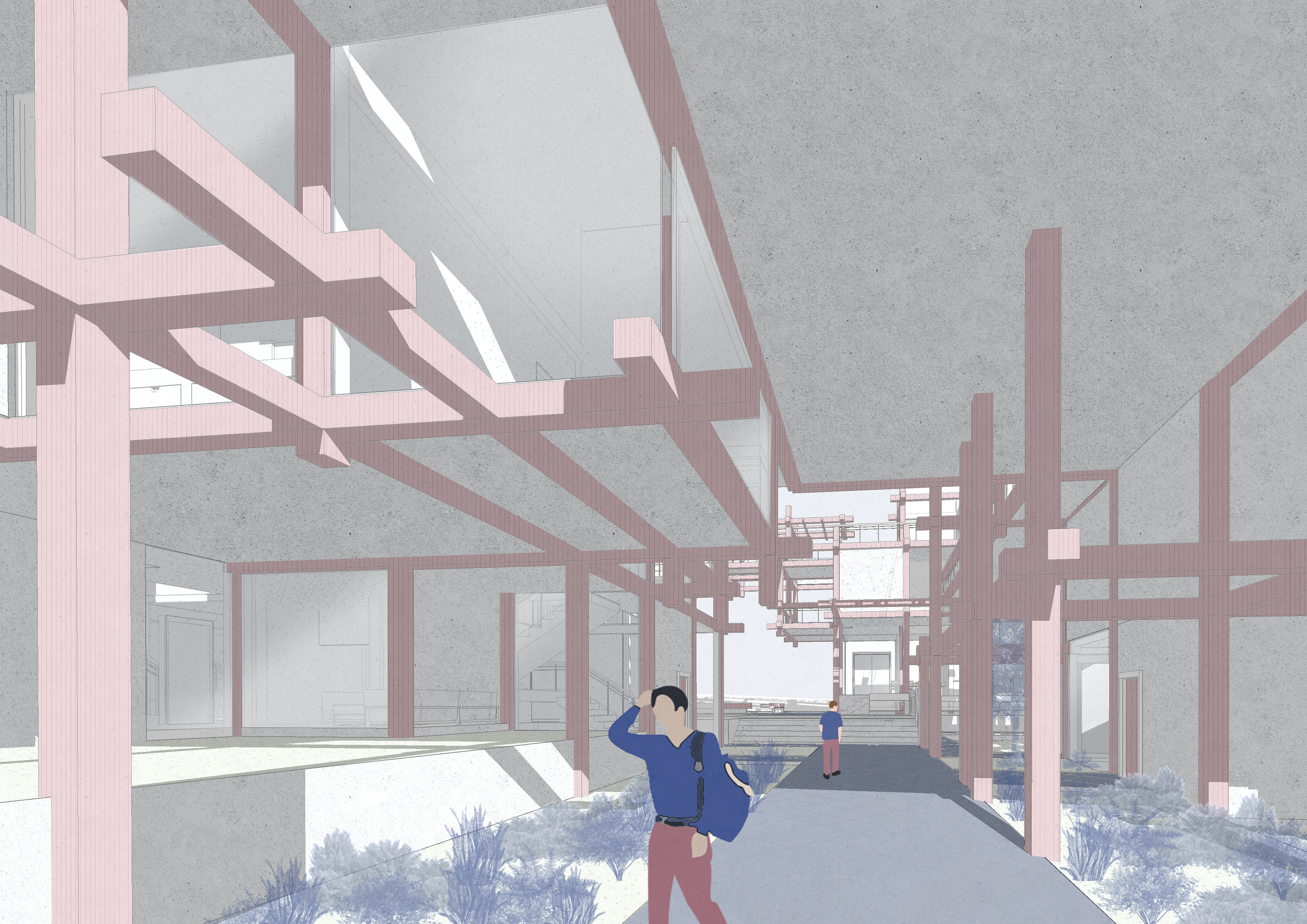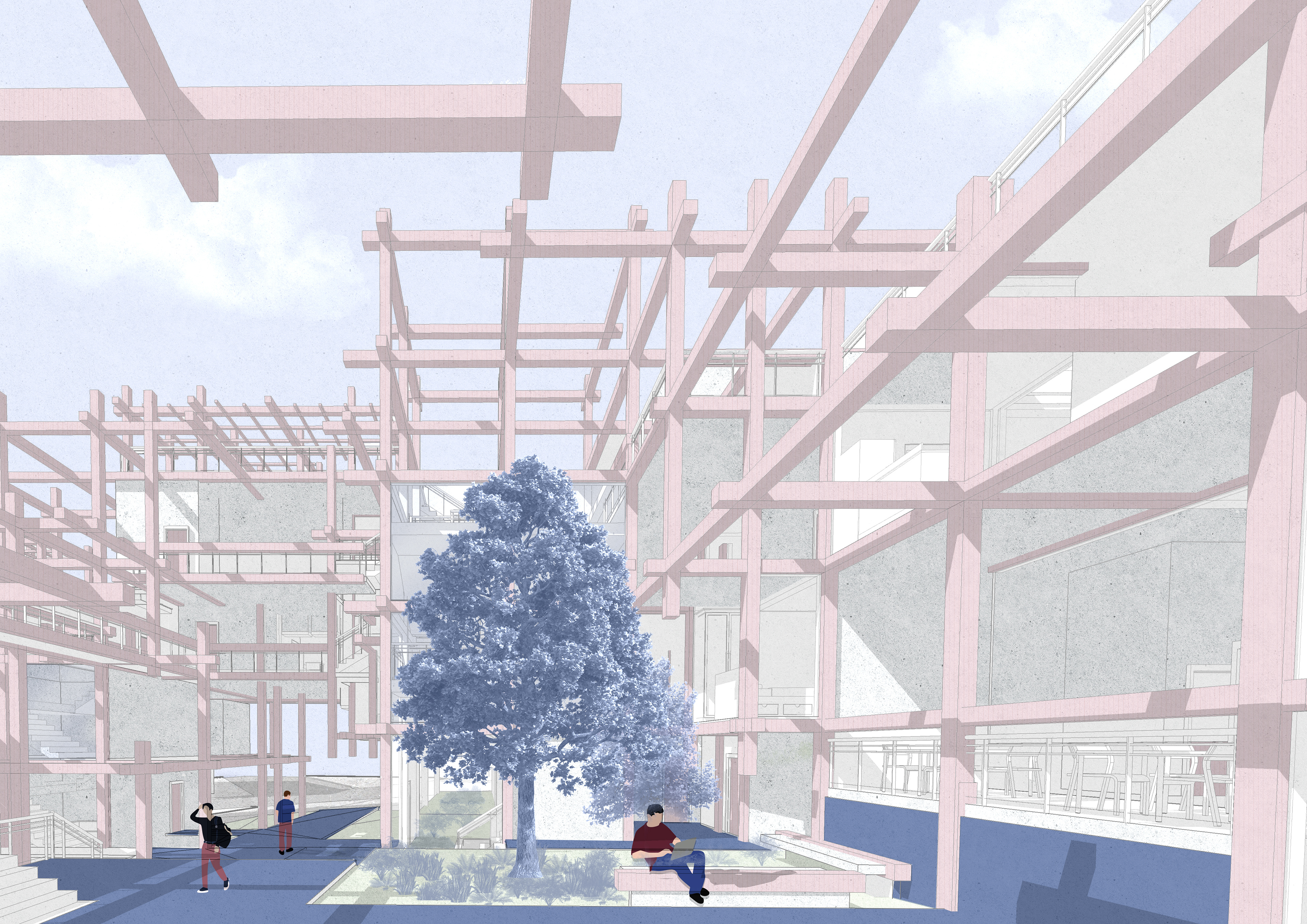 The architectural process began with a fixed grid, an orderly framework that I gradually blurred and disrupted. Using a repetitive structural module of beams and columns, I generated variations in density, transparency, and rhythm. Two circulation systems emerge- one public, connecting the neighborhood and the nearby park through the site, and another private, reserved for residents, linking a sequence of shared rooftop spaces with different degrees of intimacy.