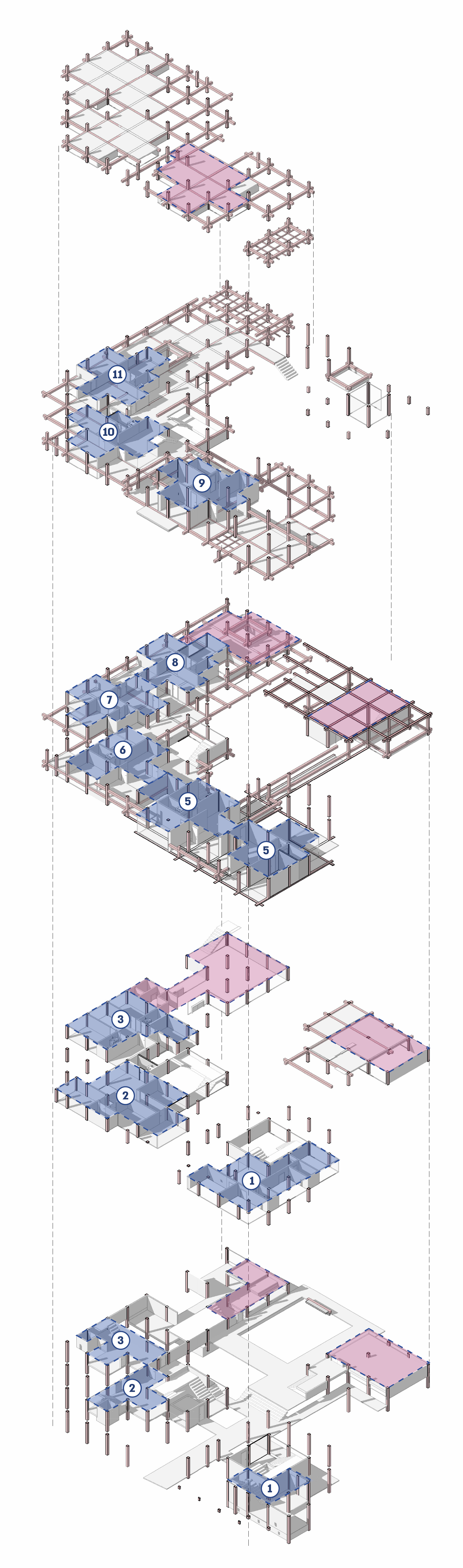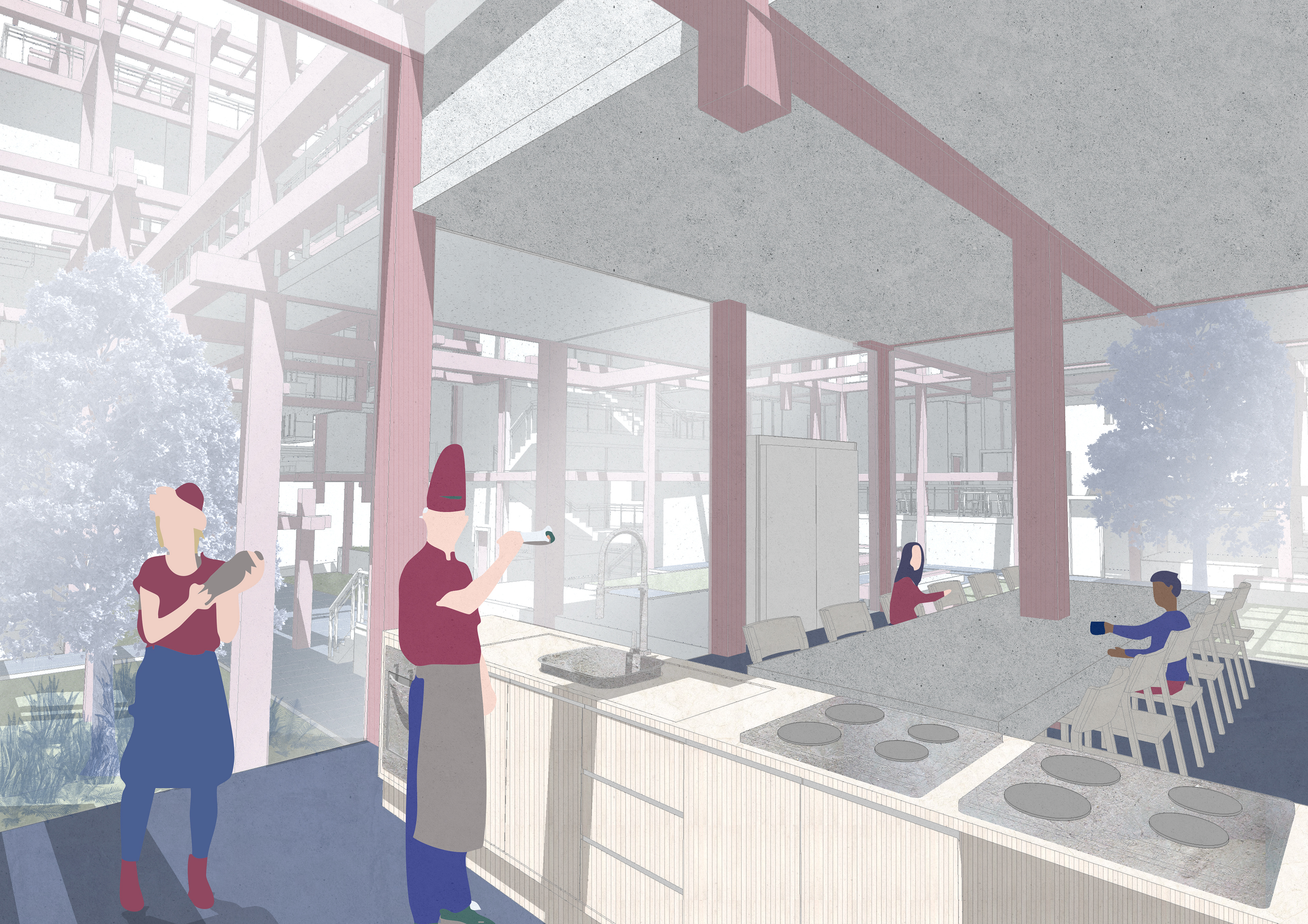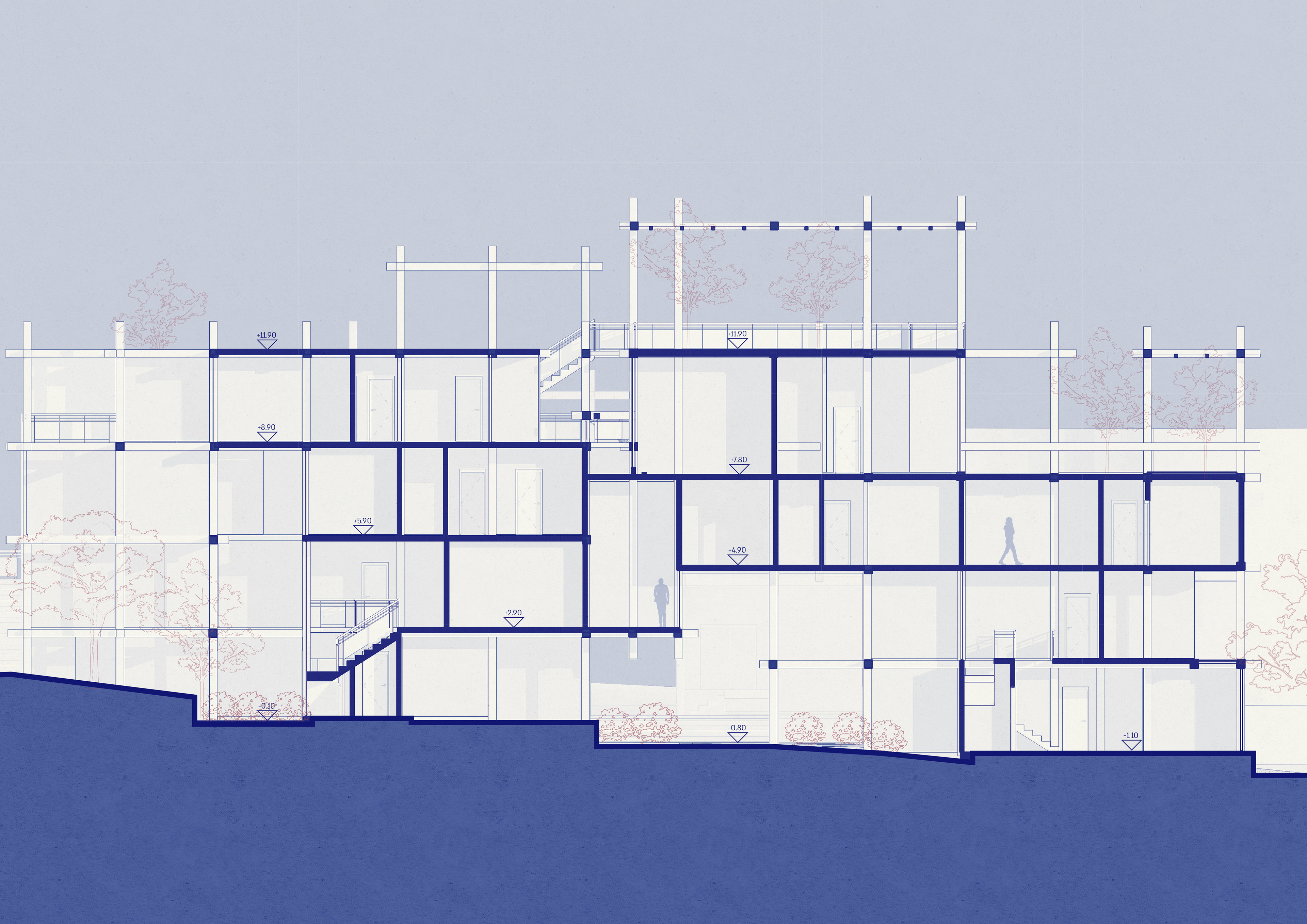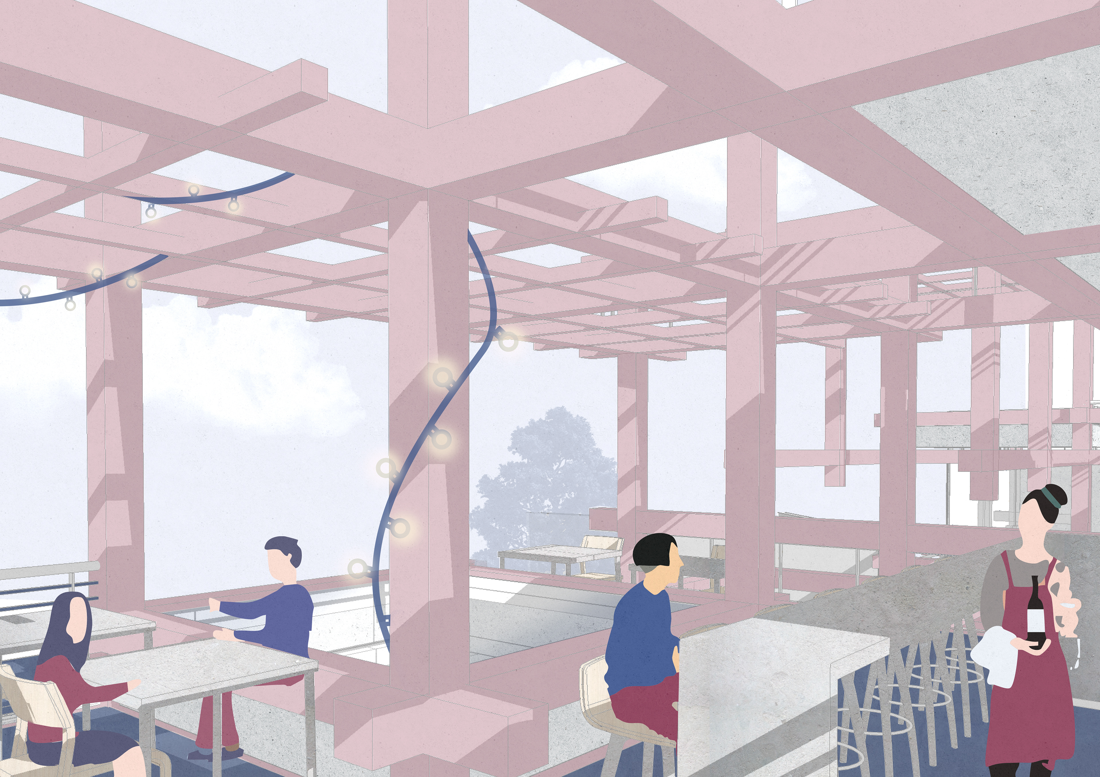 The architectural process began with a fixed grid, an orderly framework that I gradually blurred and disrupted. Using a repetitive structural module of beams and columns, I generated variations in density, transparency, and rhythm. Two circulation systems emerge- one public, connecting the neighborhood and the nearby park through the site, and another private, reserved for residents, linking a sequence of shared rooftop spaces with different degrees of intimacy.